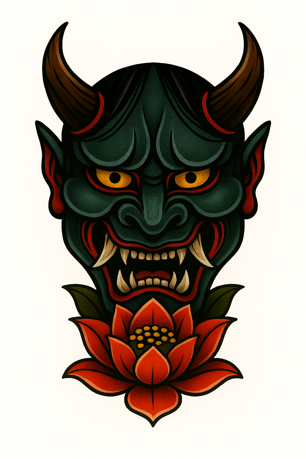 This illustration features a striking demon mask in dark tones with a lotus flower, showcasing traditional artistic elements. Ideal for art prints or tattoo designs.