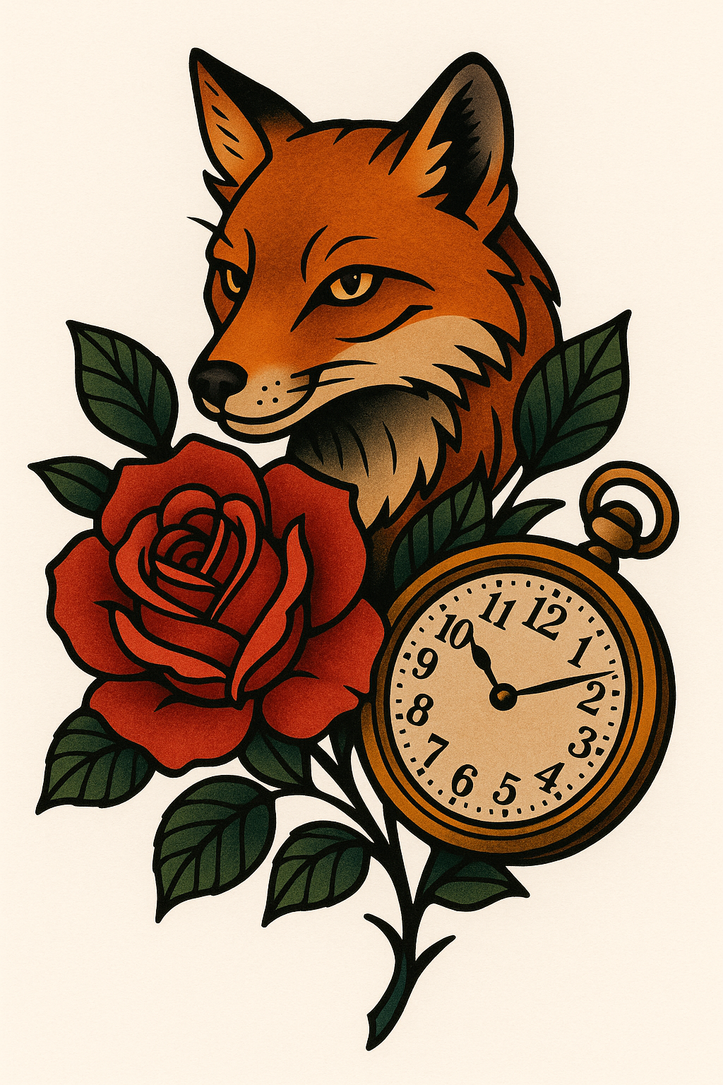 Tattoo Design Featuring a Fox, Rose, and Pocket Watch