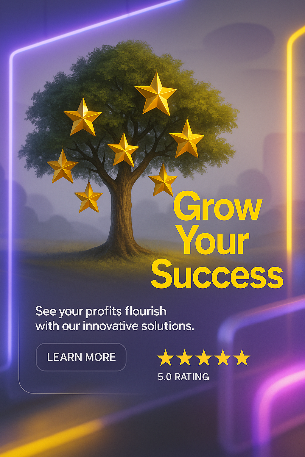 /Collection: /by davooda/Type: PNG/A visually appealing promotional graphic featuring a tree adorned with golden stars, symbolizing success and growth. Ideal for marketing innovative business solutions.