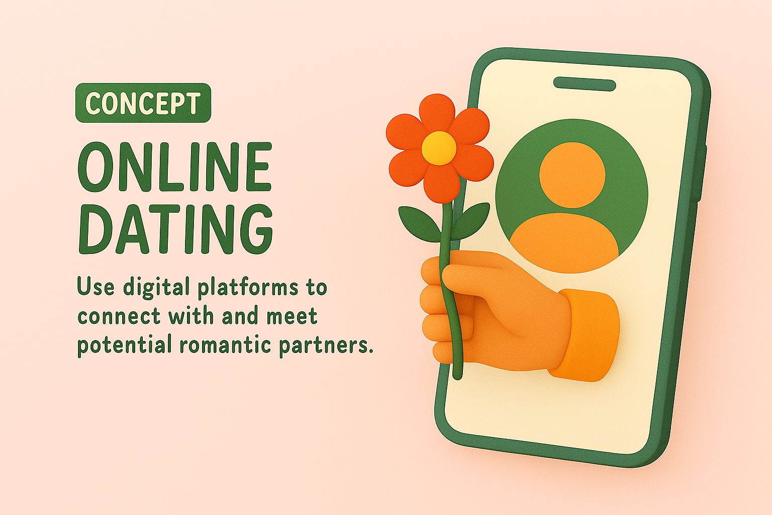 /Collection: /by davooda/Type: PNG/A vibrant and playful illustration representing online dating, featuring a hand holding a flower emerging from a smartphone. Ideal for digital marketing and relationship advice content.