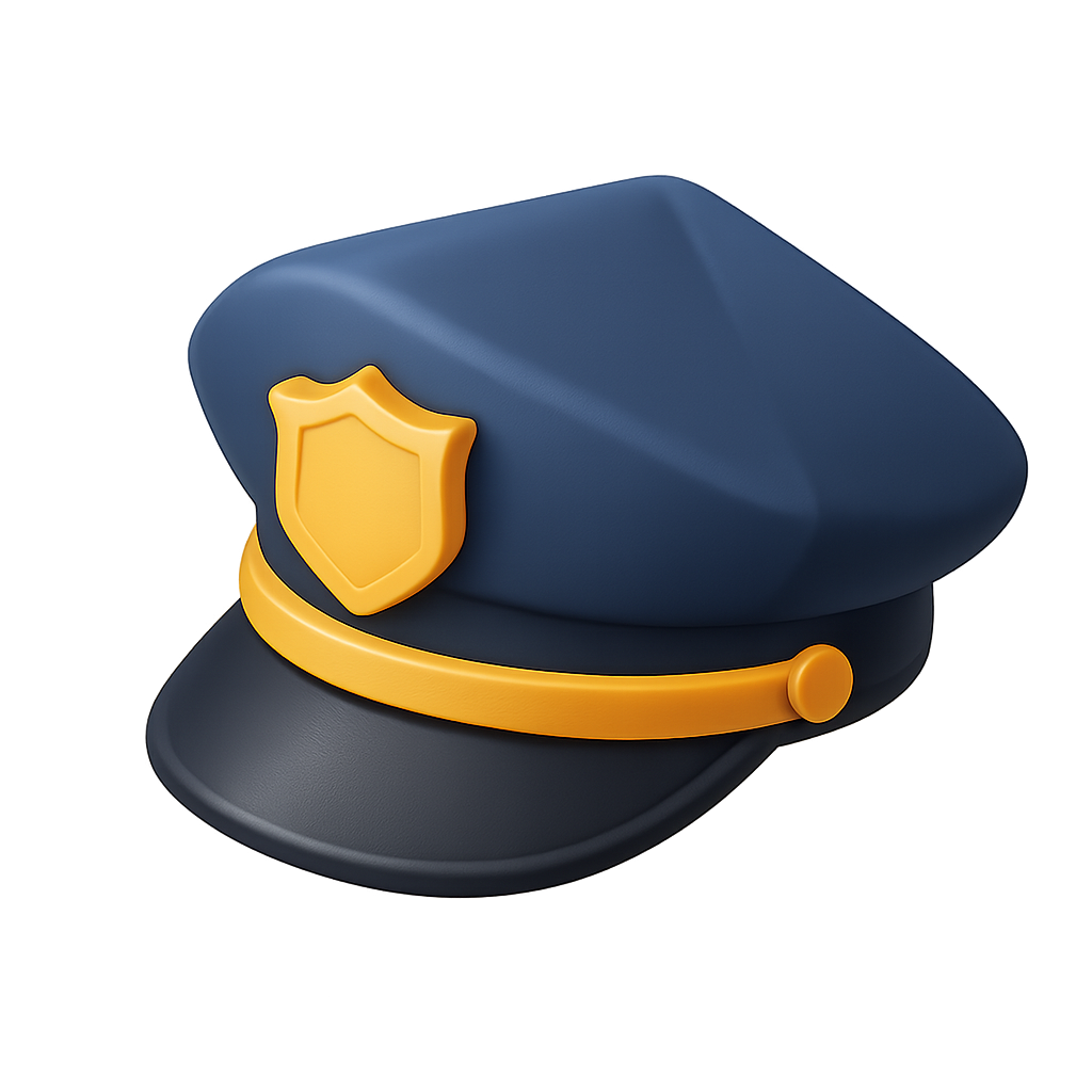 A stylized 3D icon of a police officer's hat featuring a blue color with a yellow badge and band, presented in a three-quarter isometric view against a dark background.