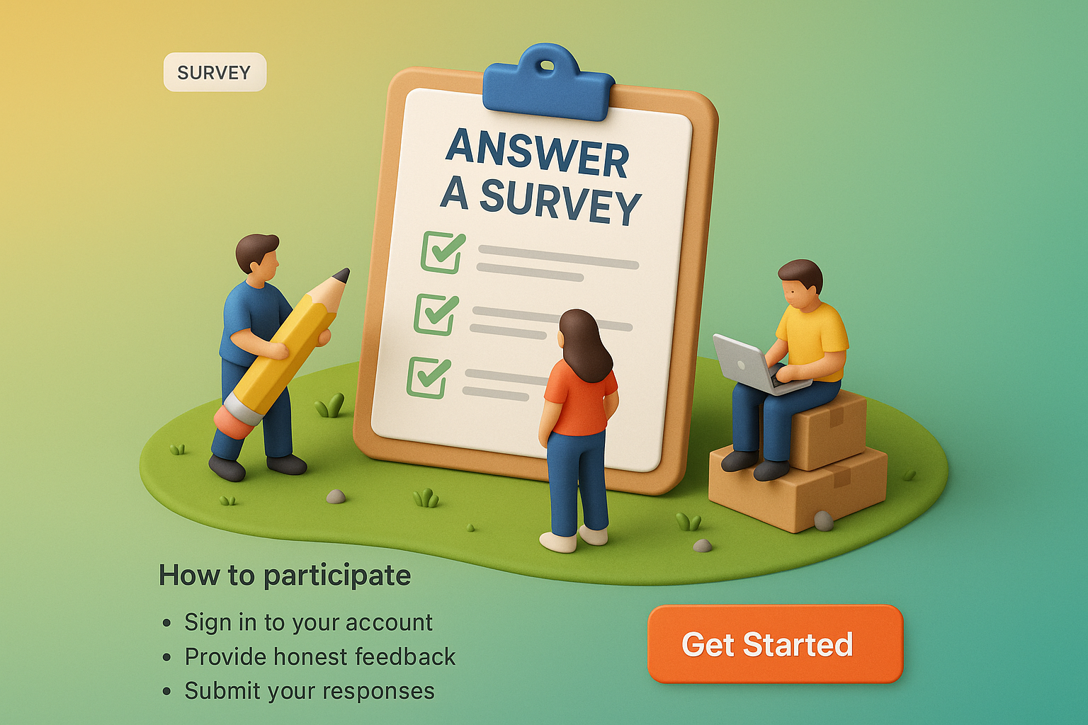 A colorful 3D scene depicting small figures engaging with a survey. They interact with a large survey form, emphasizing user participation. The vibrant gradient background enhances the visual appeal.