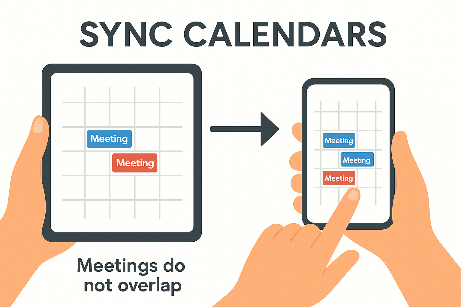 /Collection: /by davooda/Type: PNG/A vector graphic illustrating the concept of syncing calendars, featuring hands interacting with a tablet and smartphone. This design is ideal for digital productivity tools or applications.