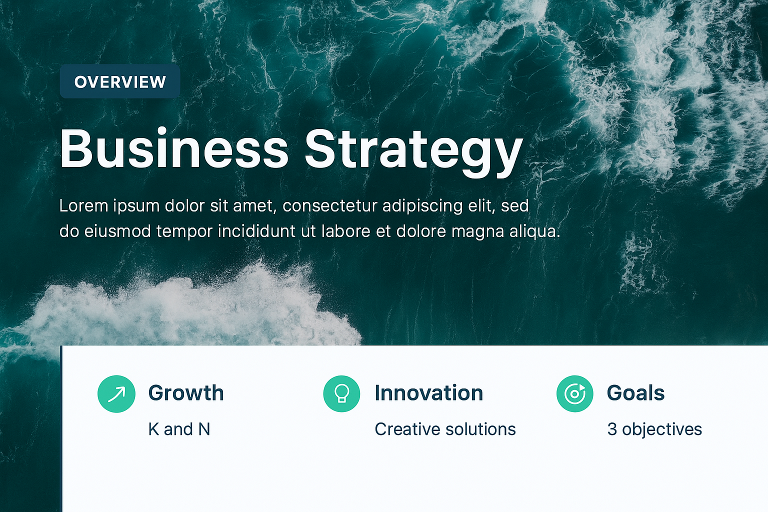 Professional presentation slide featuring a business strategy overview with sections for growth, innovation, and goals. The modern design incorporates a visually appealing ocean background.