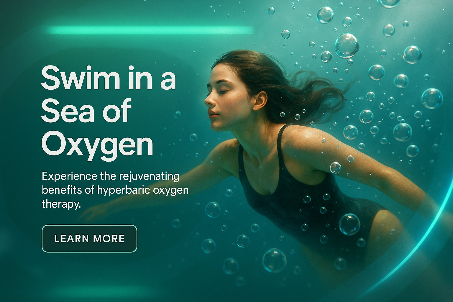 Engaging promotional banner showcasing the benefits of hyperbaric oxygen therapy through an underwater theme, targeting health and wellness audiences.