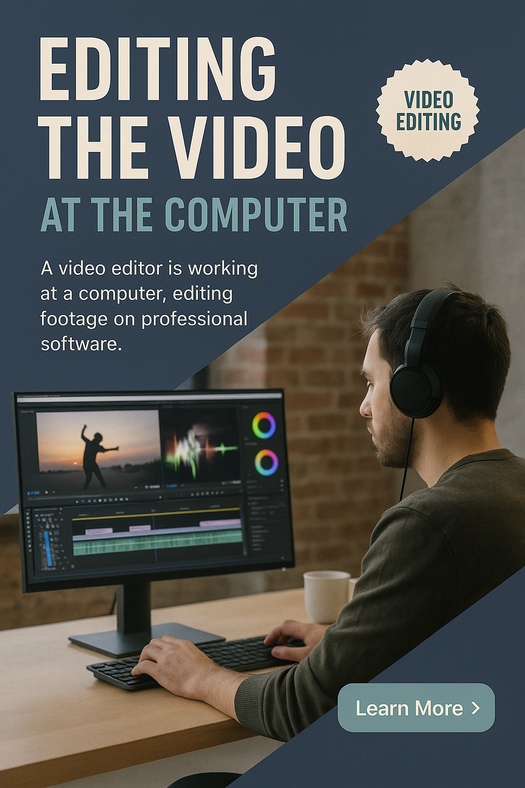 A realistic portrayal of a video editor focused on their work at a computer, editing footage with professional software. The background features a cozy workspace.