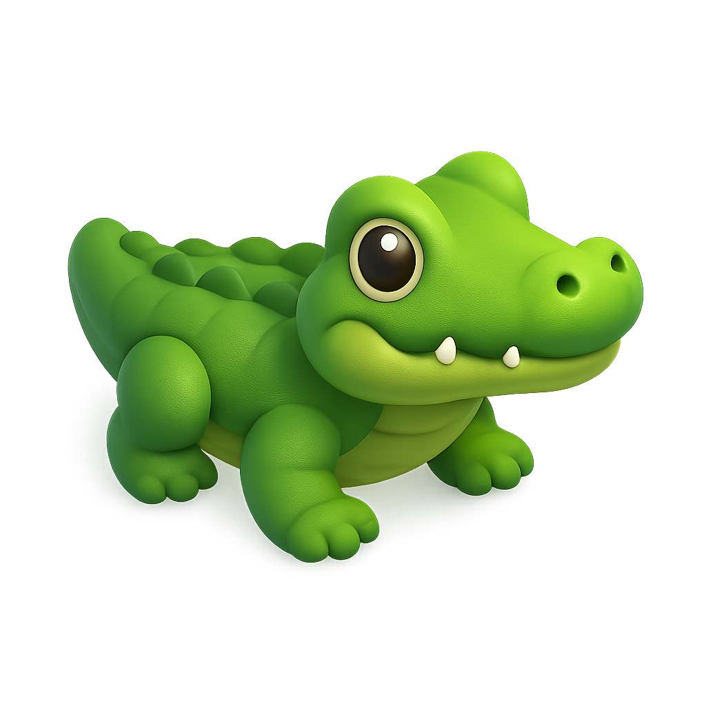 A charming 3D icon of a caiman, featuring a rounded body and large eyes. The design is simple yet playful, set against a soft gradient background that enhances its volumetric appearance.