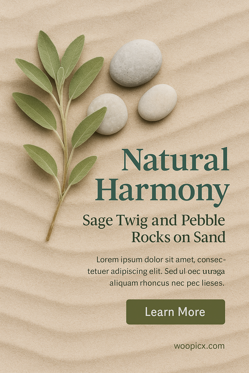 Nature-Themed Promotional Graphic Featuring Sage Twig and Pebbles