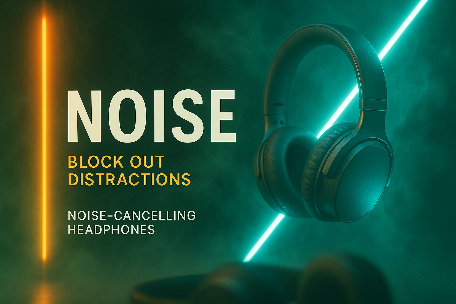 An eye-catching advertisement featuring noise-cancelling headphones. Neon accents illuminate the scene, creating a foggy atmosphere with a professional yet engaging aesthetic.