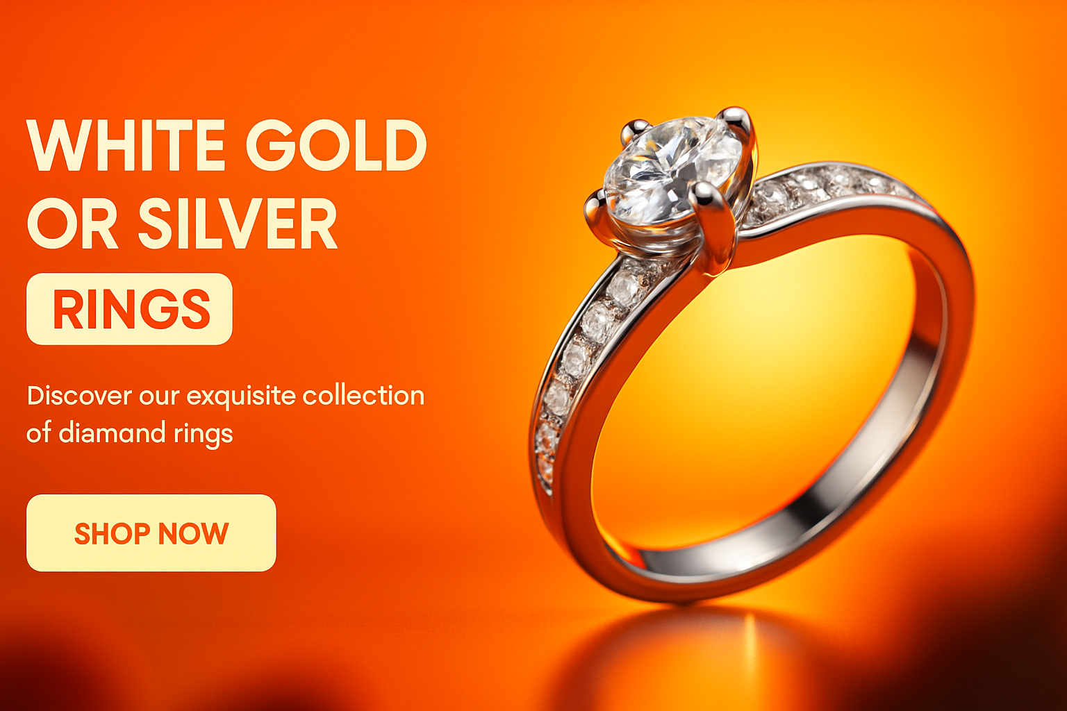 /Collection: /by davooda/Type: PNG/A vibrant promotional banner showcasing a diamond ring, emphasizing options in white gold or silver. Ideal for jewelry retailers targeting fashion-conscious consumers.
