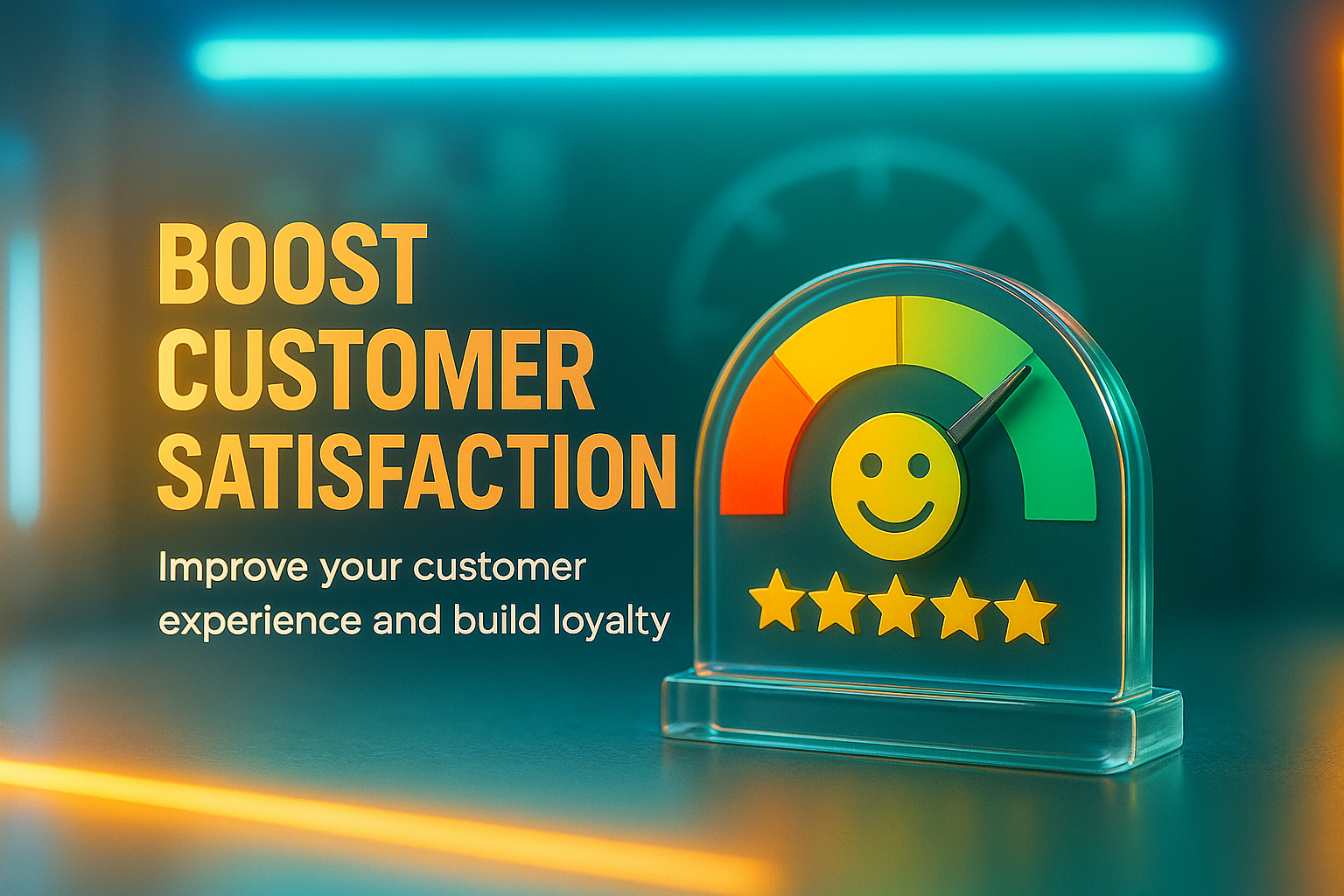 /Collection: /by davooda/Type: PNG/Vibrant graphic featuring a satisfaction gauge with a smiley face, designed to promote customer experience improvement strategies. Suitable for marketing materials.