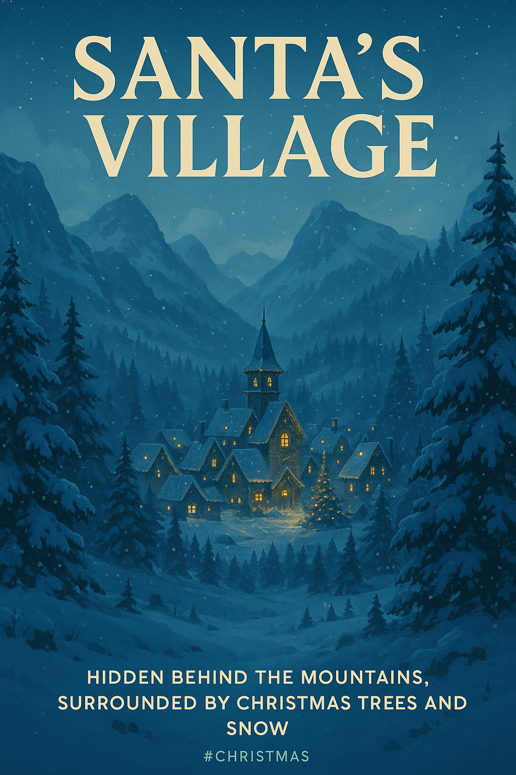 A beautifully illustrated winter scene depicting Santa's Village nestled among snowy mountains, ideal for holiday promotions or festive events.