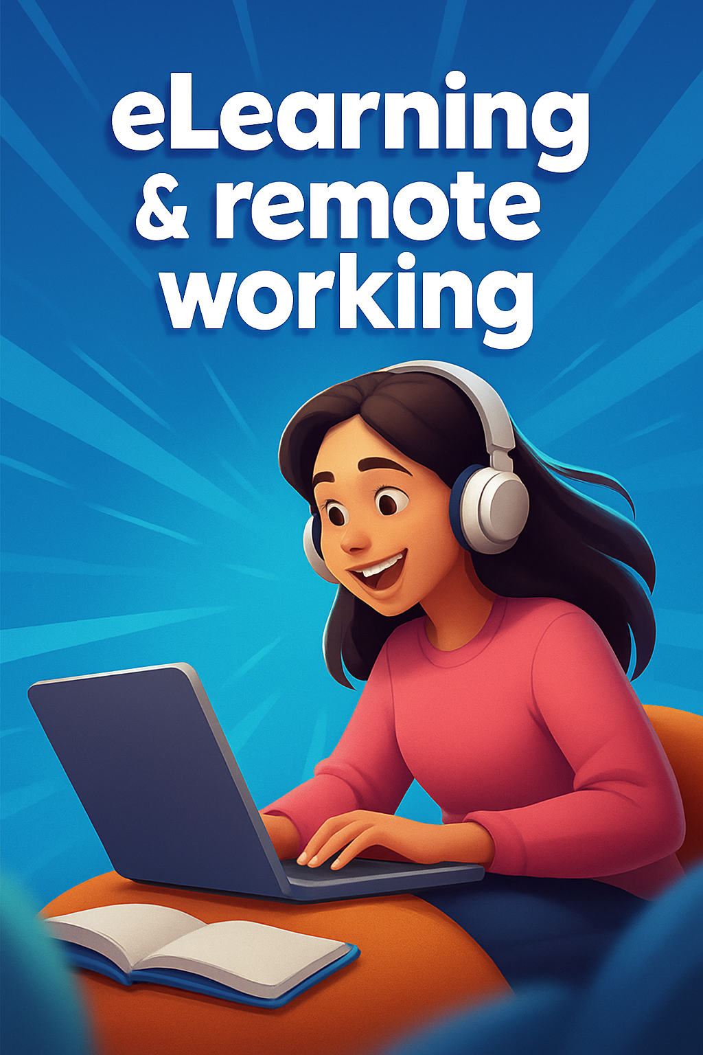 /Collection: /by davooda/Type: PNG/A young woman engaged in eLearning at home, smiling while using her laptop. The background features dynamic rays radiating outward in a vibrant blue gradient, creating an energetic atmosphere.