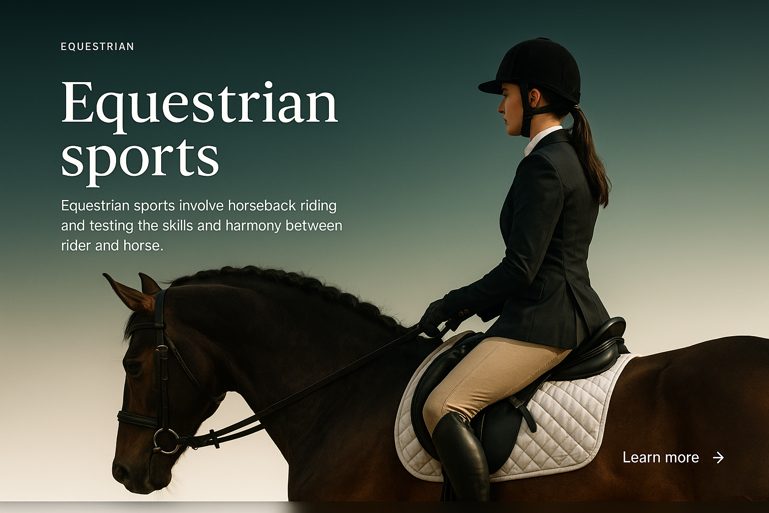 A visually striking design featuring a horse and rider, showcasing equestrian sports. The composition includes a gradient background and text elements for a cohesive web page layout.