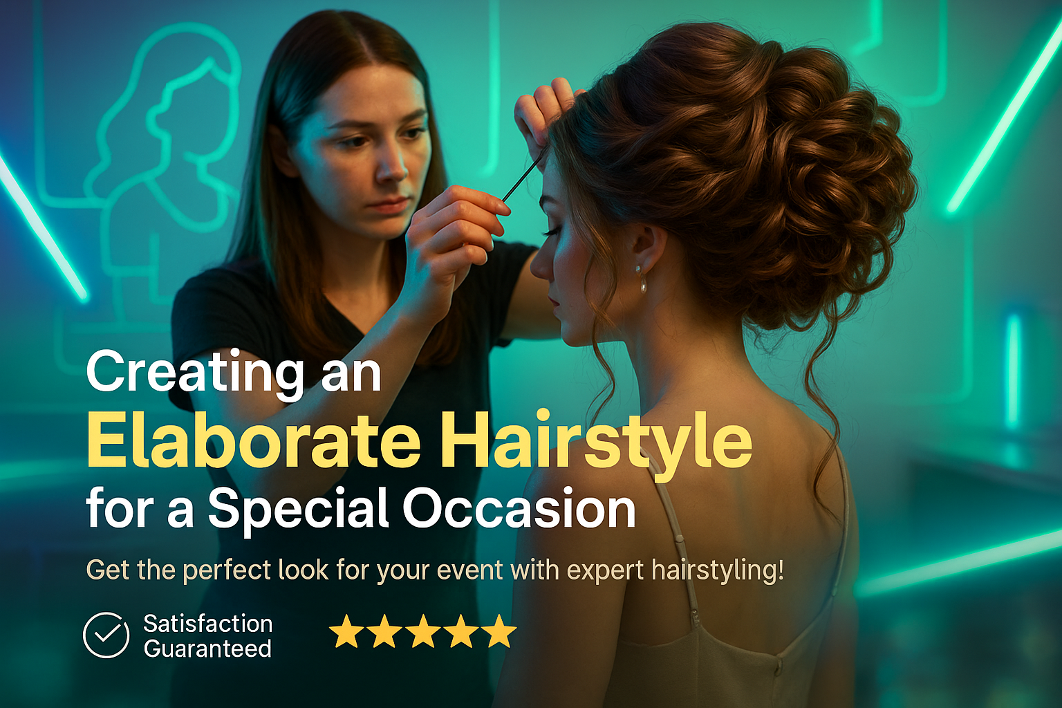 A visually appealing promotional image showcasing a hairstylist creating an elaborate hairstyle for a special occasion, ideal for beauty industry marketing.