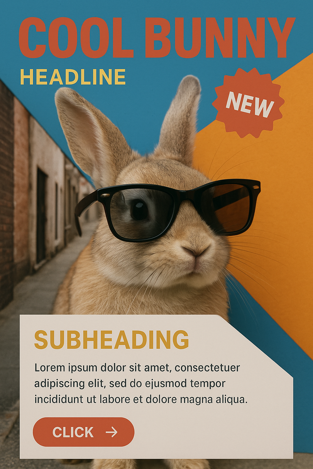 /Collection: /by davooda/Type: PNG/A realistic bunny wearing sunglasses stands prominently in a vibrant, colorful setting. The design features layered composition with engaging text elements and a playful aesthetic.