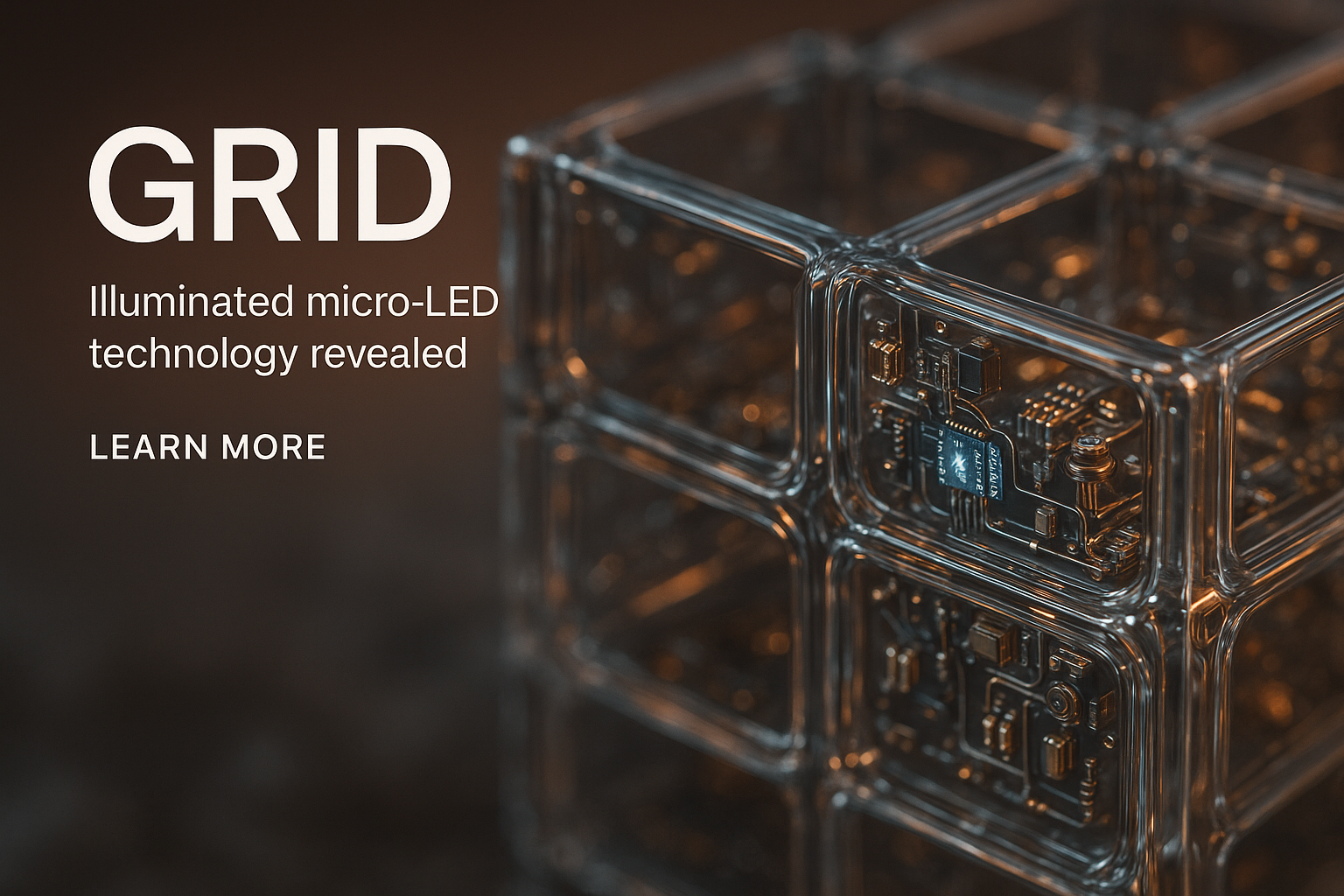 /Collection: /by davooda/Type: PNG/This image showcases a hyperrealistic 3D grid structure made from clear polymers, revealing glowing micro-LEDs and intricate circuitry. The design features elegant reflections and ambient lighting effects.