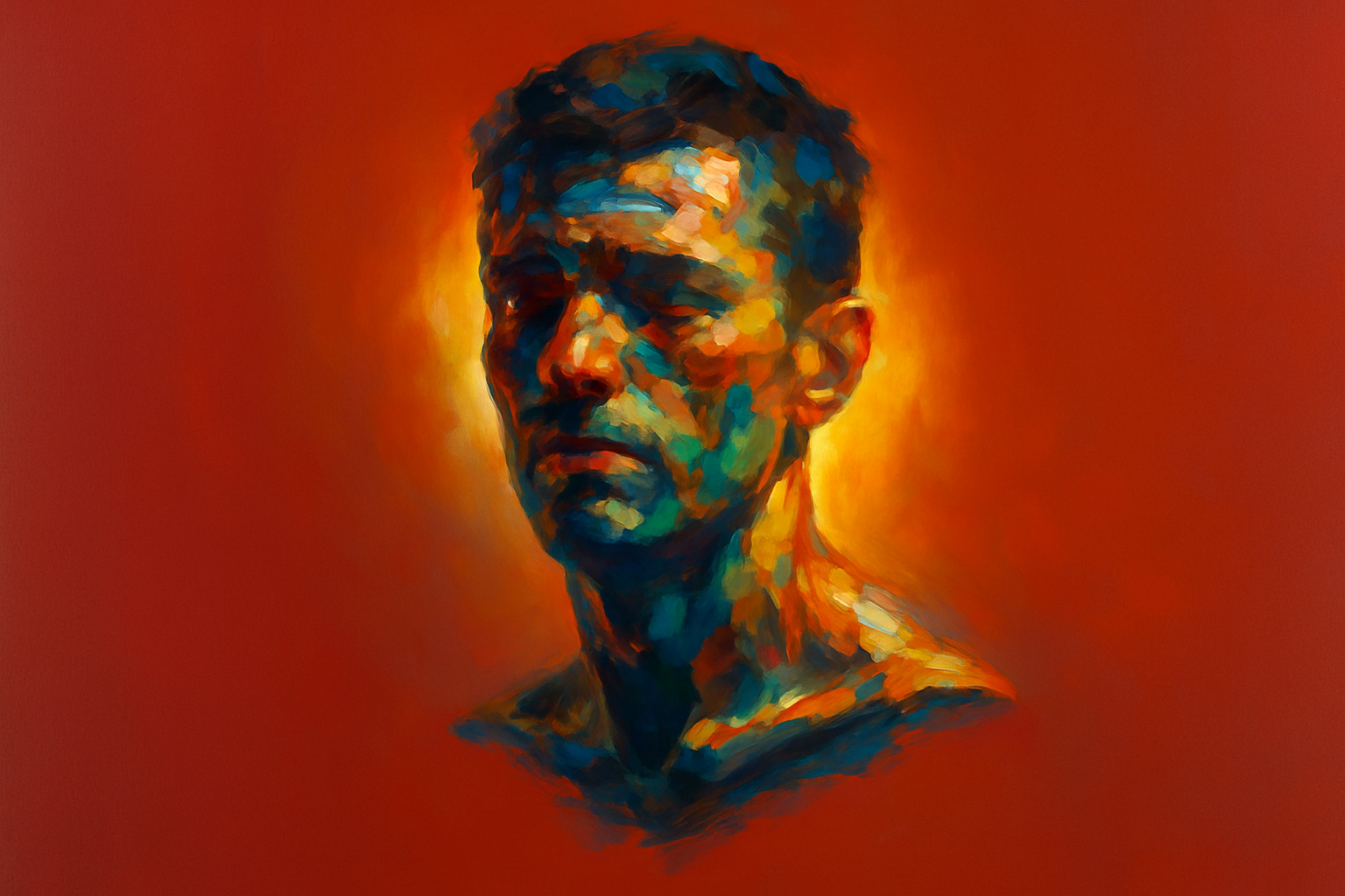 This image features a striking abstract portrait of a person, highlighted by vivid colors against a solid red background. The subject's face is illuminated with contrasting light, creating depth and focus.