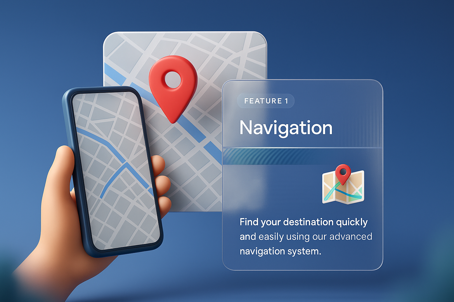 /Collection: /by davooda/Type: PNG/A hand holding a smartphone displaying a city map with a marked location. In the background, a sleek navigation feature highlights the ease of finding destinations.