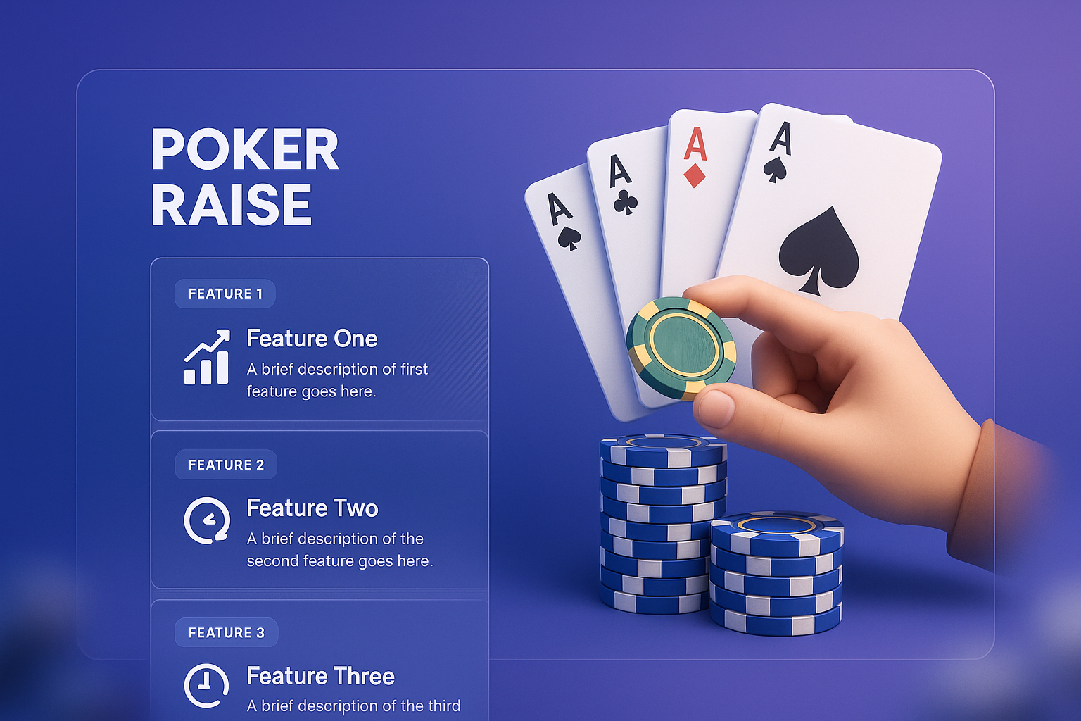 /Collection: /by davooda/Type: PNG/A dynamic 3D illustration showcasing a poker raise. Features include a hand holding chips and playing cards, with a modern layout highlighting three distinct features.