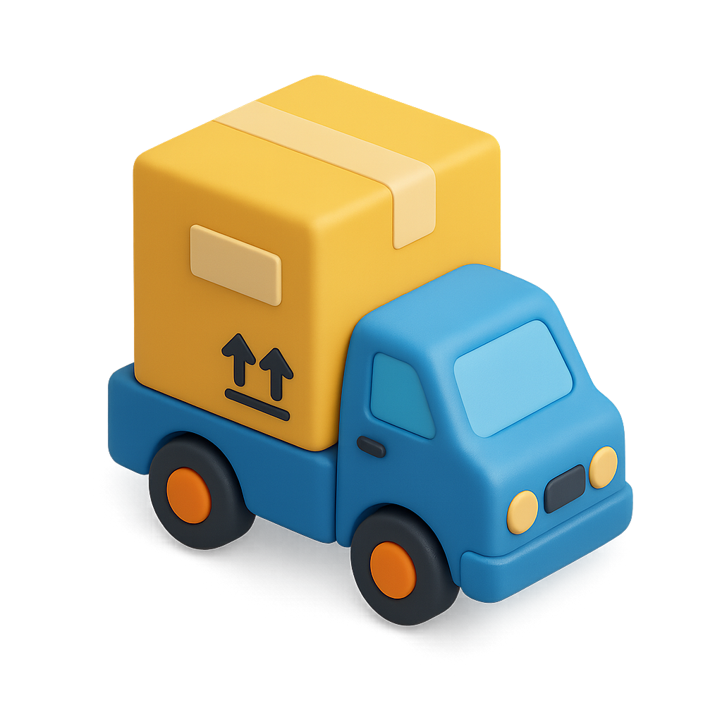 A vibrant 3D icon depicting a toy-like blue truck carrying a yellow box. The design features a playful style with a three-quarter view and a transparent background.