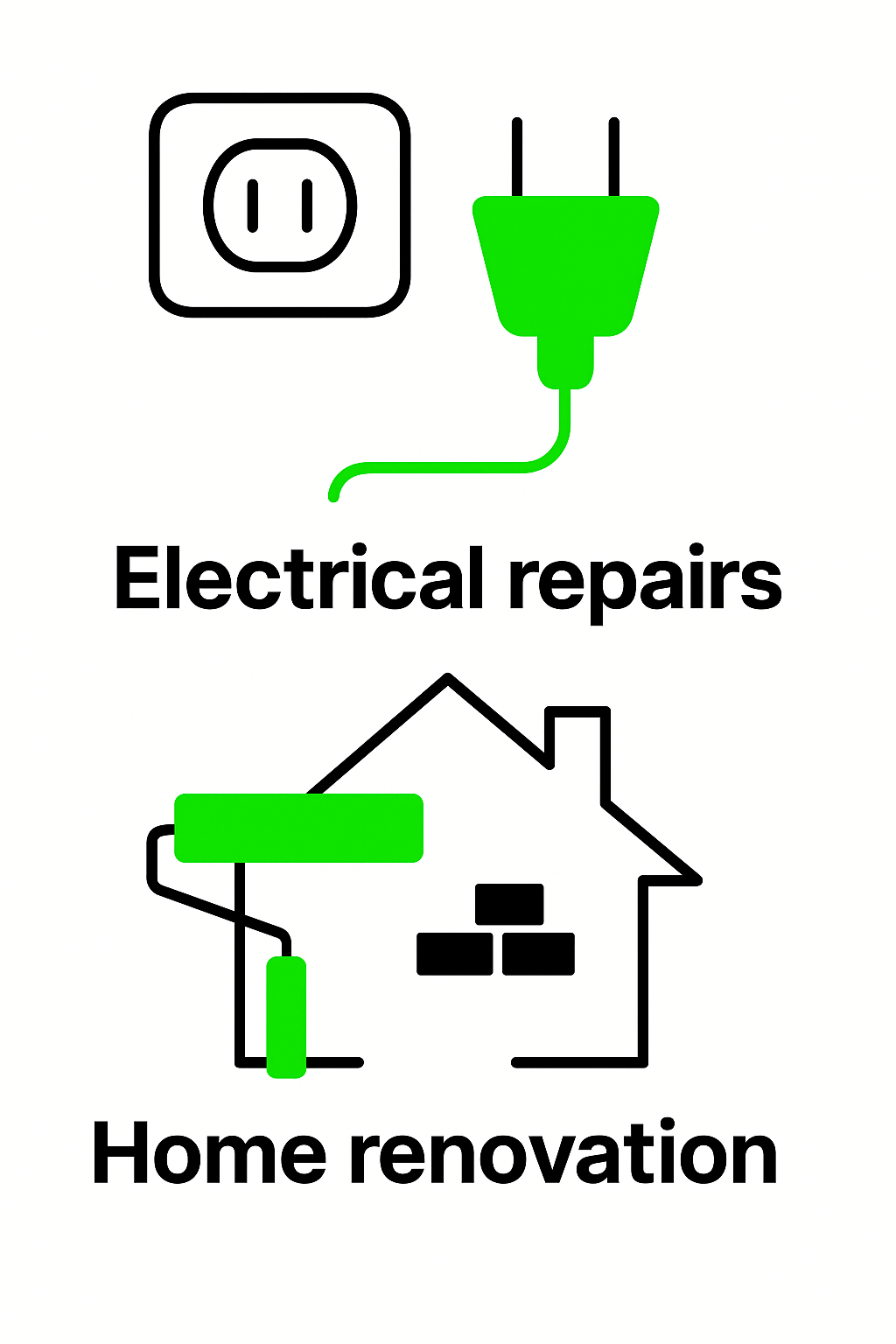 Simple, clean graphic illustrating electrical repairs and home renovation services with a minimalist design, suitable for service advertisements or informational materials.