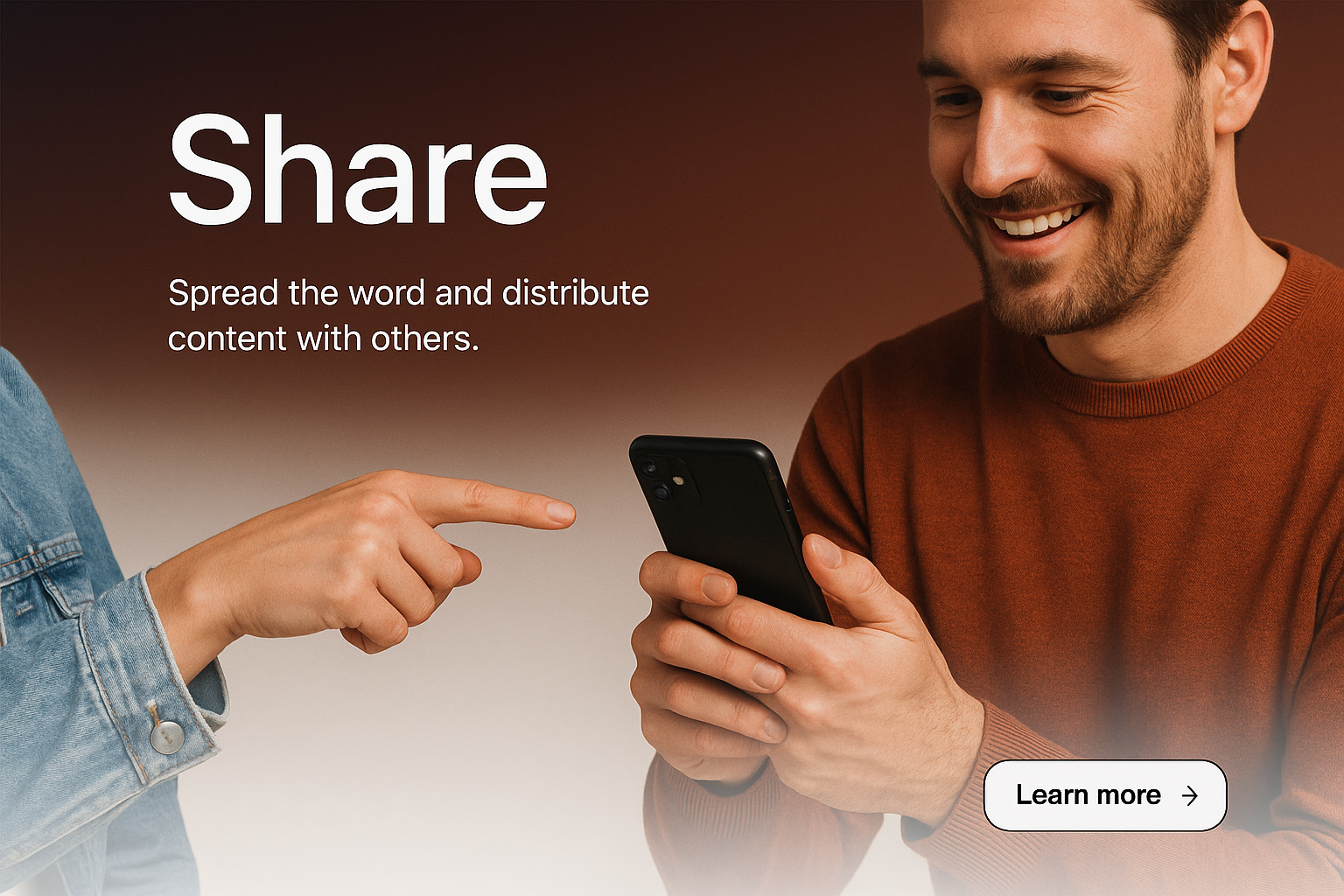 A modern web page design showcasing the concept of sharing content. Features a person using a smartphone, with a clean layout and a clear call to action.