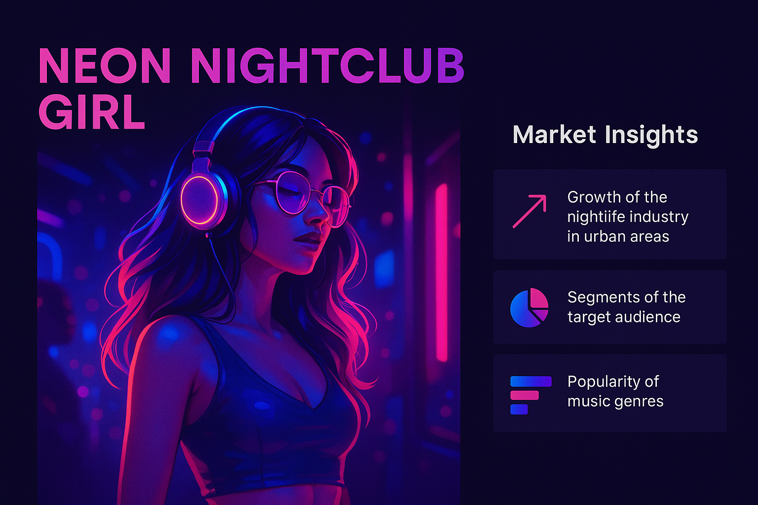 Dynamic graphic showcasing a neon-themed nightclub girl, combined with market insights on nightlife trends. Ideal for nightlife industry presentations or promotional materials.