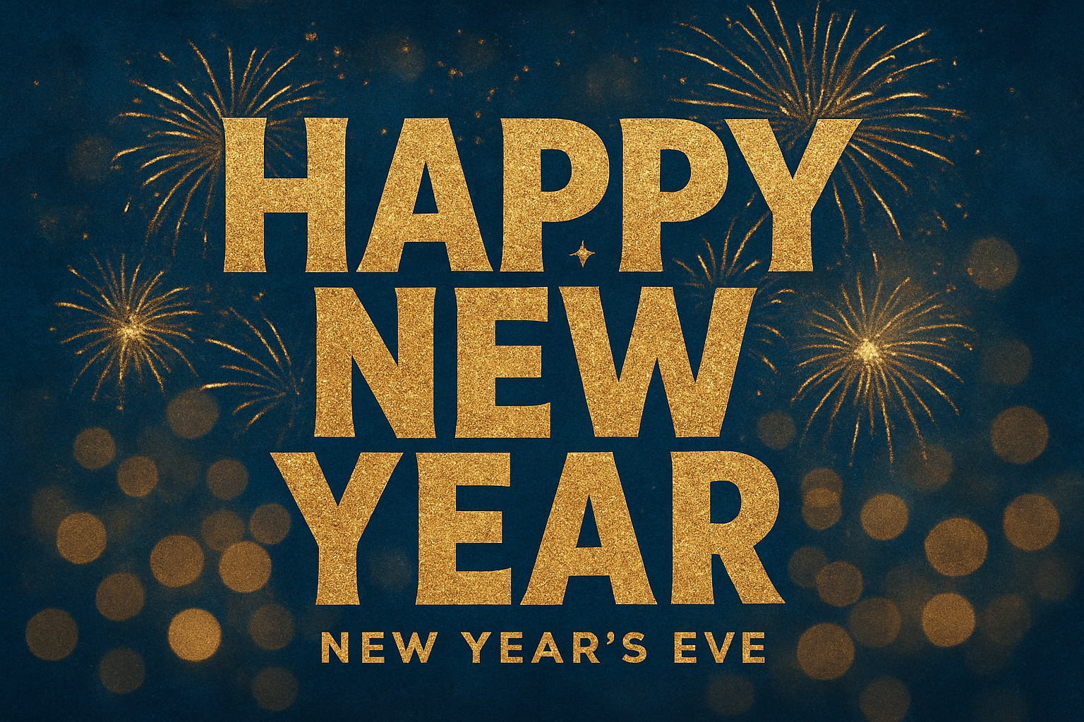 Vibrant graphic celebrating New Year's Eve, featuring bold typography and festive elements like fireworks and bokeh effects, ideal for social media promotions.