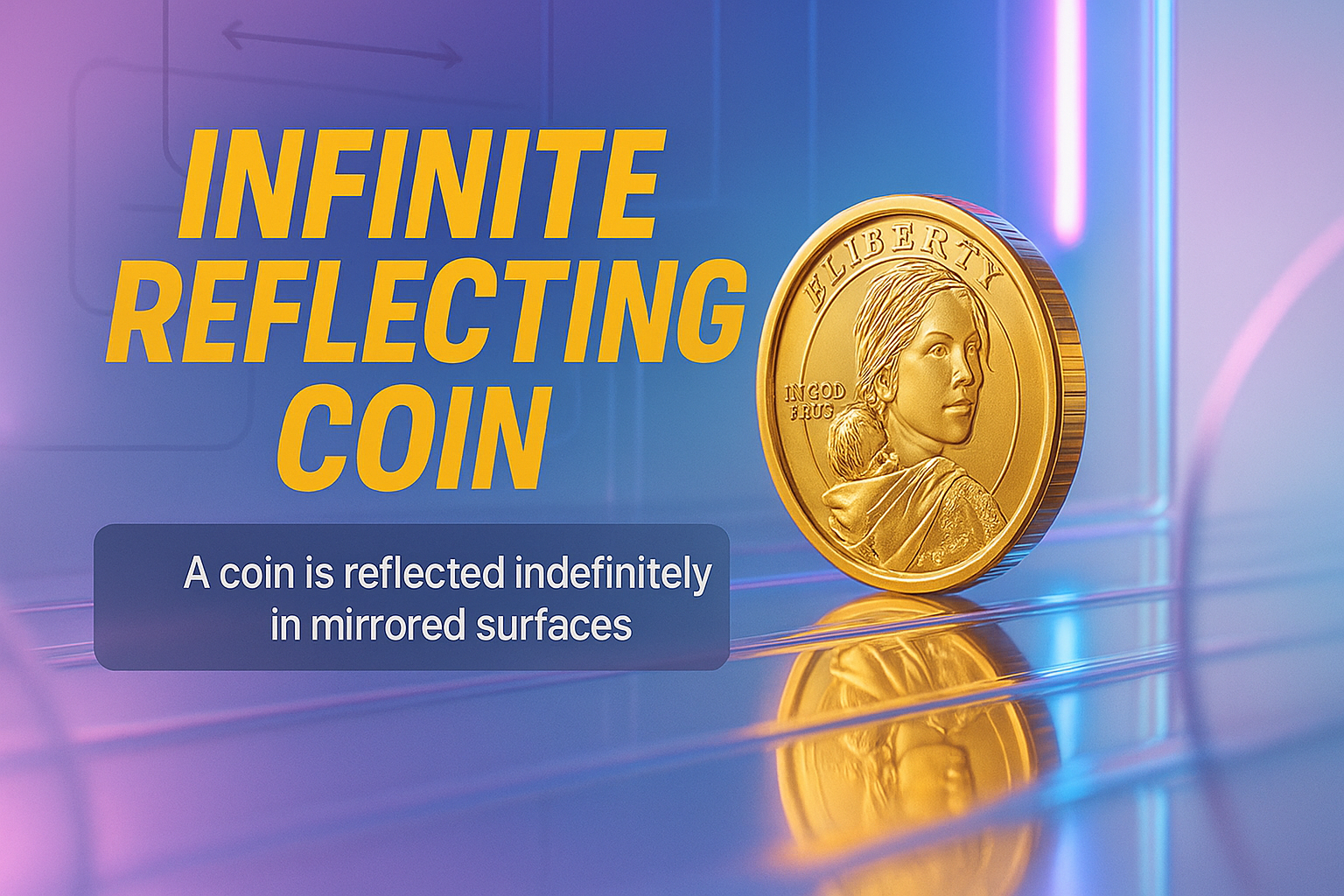 /Collection: /by davooda/Type: PNG/A visually striking 3D render showcasing a coin reflected infinitely in mirrored surfaces, emphasizing a modern, tech-inspired aesthetic suitable for digital art or finance-related themes.