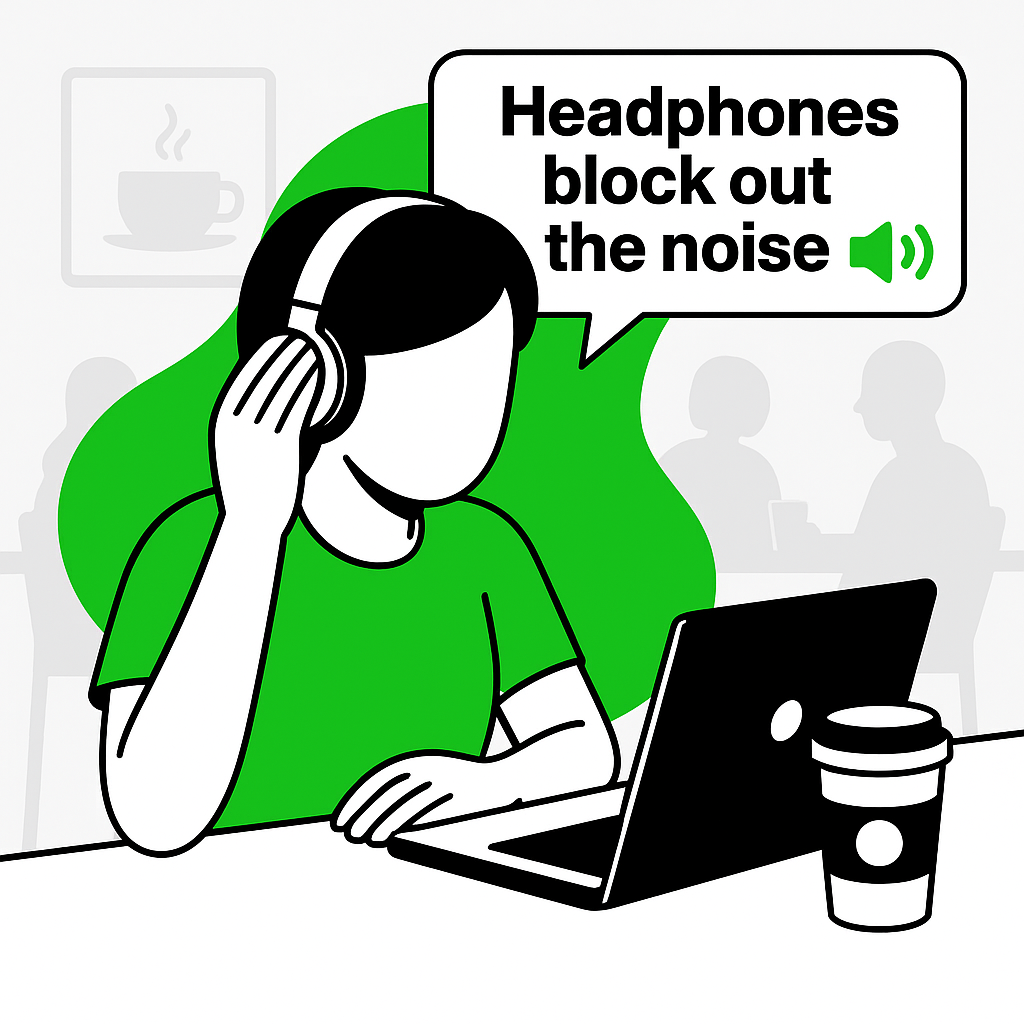 /Collection: /by davooda/Type: PNG/A modern, minimalist illustration depicting a person wearing headphones while working on a laptop, emphasizing concentration and noise reduction. Ideal for tech and productivity themes.