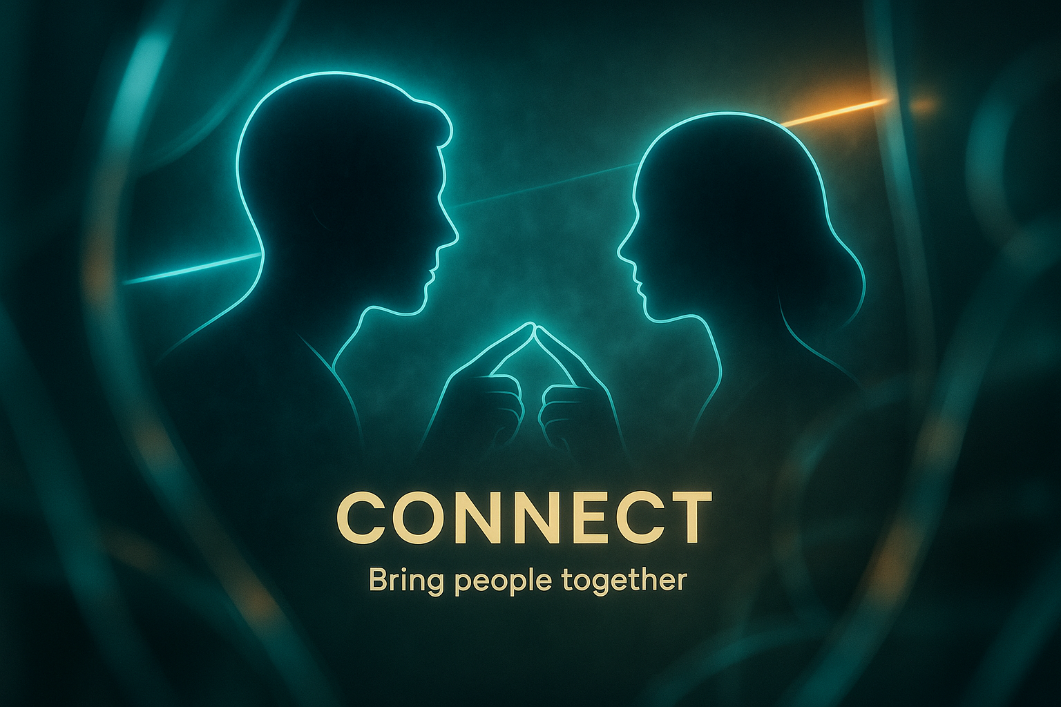 This image features glowing silhouettes of two people forming a connection with neon accents. The background is softly illuminated, enhancing the ethereal feel.