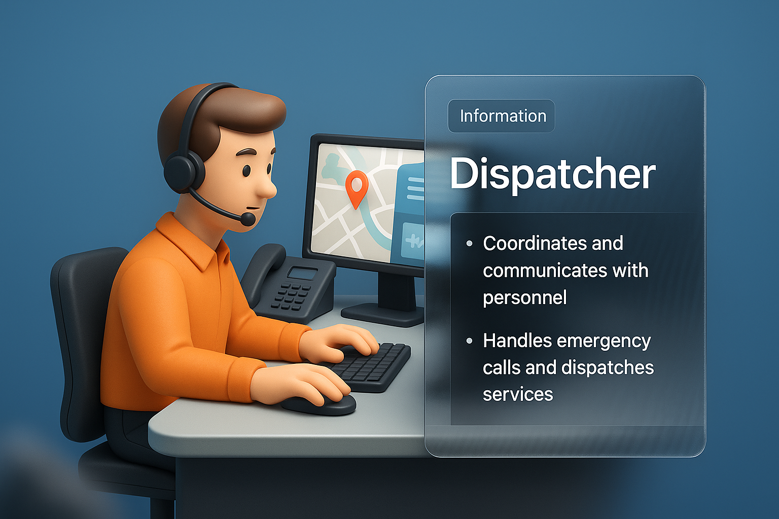 /Collection: /by davooda/Type: PNG/A 3D illustration depicting a dispatcher at a desk with a computer, headset, and a phone. An overlay provides key information about the dispatcher’s role, featuring a modern design.