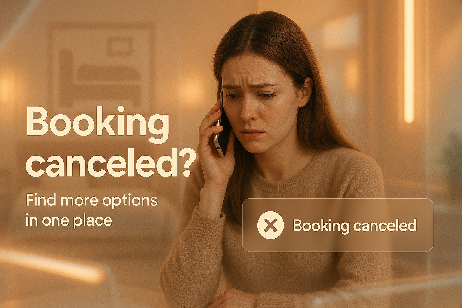 /Collection: /by davooda/Type: PNG/A digital graphic depicting a concerned woman on the phone, conveying frustration over a booking cancellation. The soft color palette and modern design elements aim to resonate with an audience seeking travel or accommodation solutions.