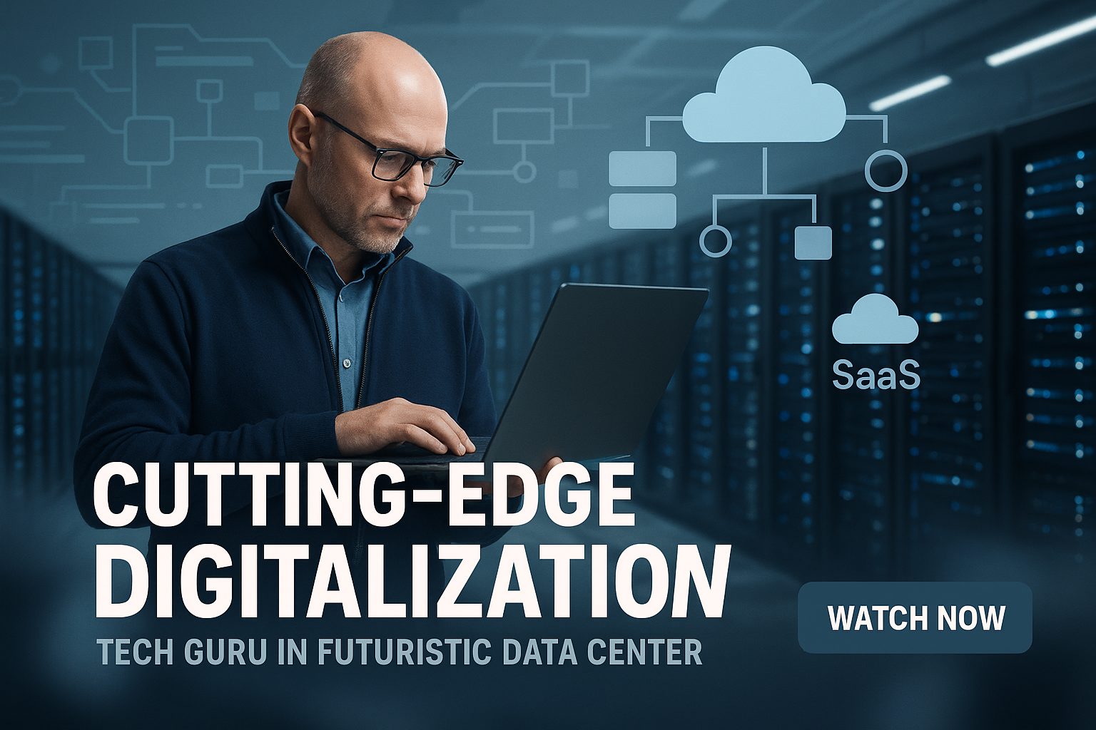 Dynamic promotional graphic showcasing a tech expert in a modern data center, ideal for marketing digital transformation services or technology events.