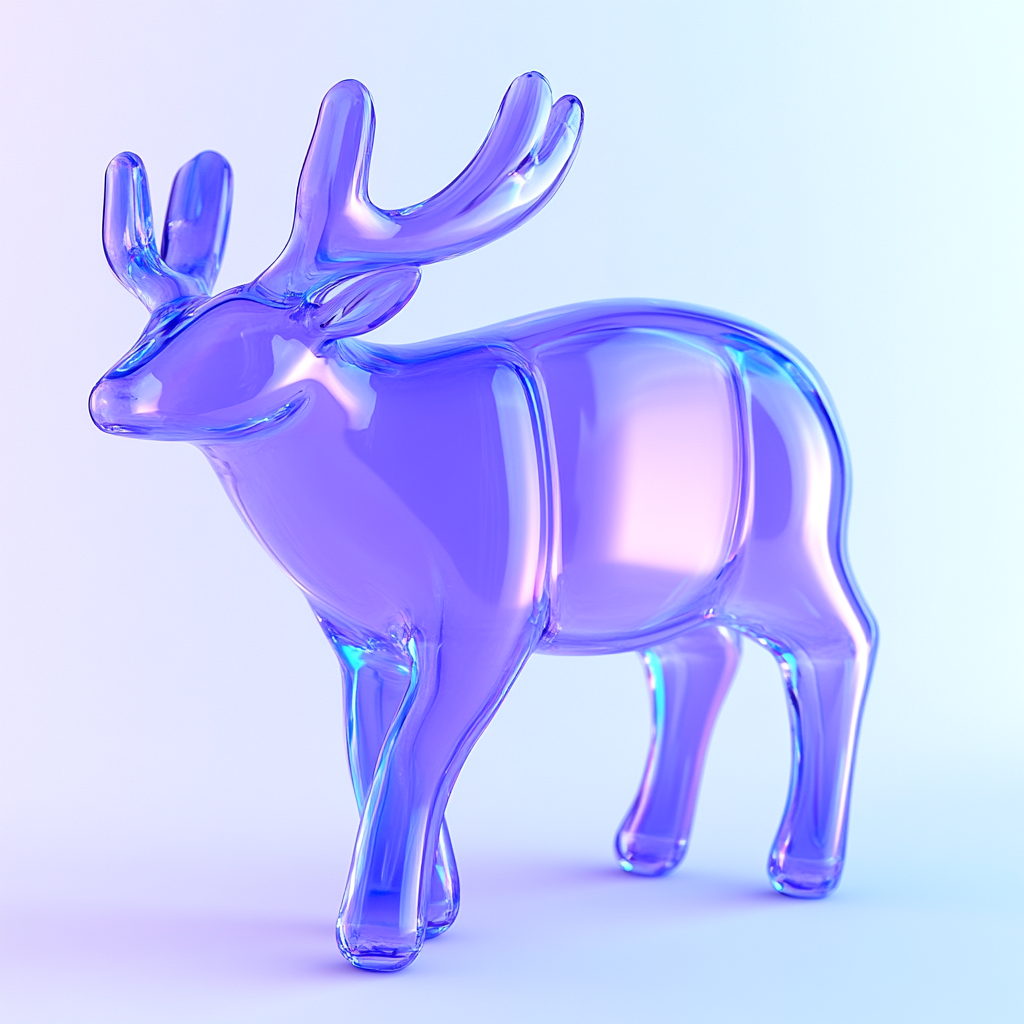 A modern 3D render of a deer sculpture made from translucent glass, featuring a pastel color palette. Ideal for decorative purposes or artistic displays.
