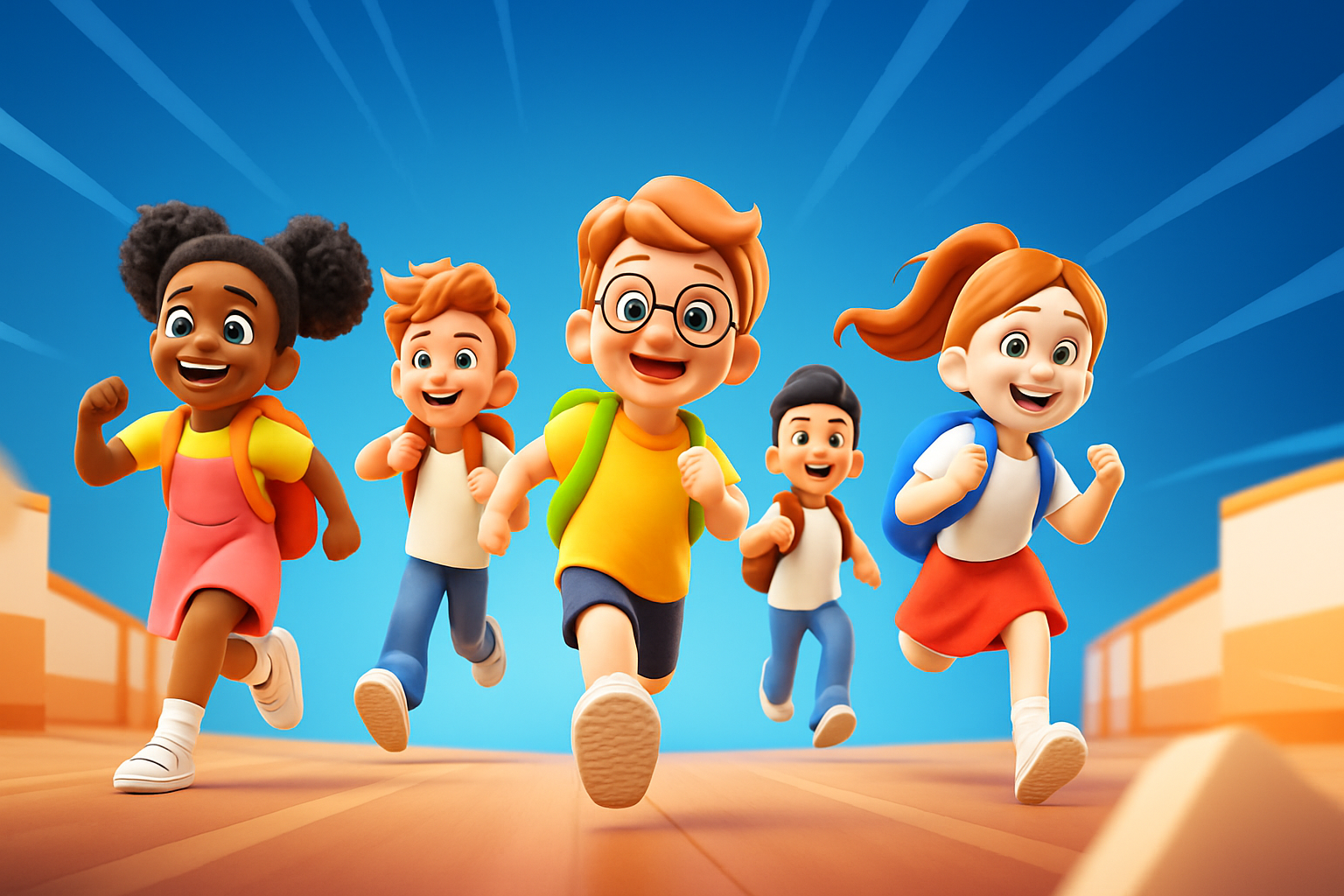 /Collection: /by davooda/Type: PNG/A vibrant illustration of cheerful children joyfully running along school corridors, capturing the excitement of back-to-school. The scene features a dynamic composition with bright colors and a smooth gradient background.
