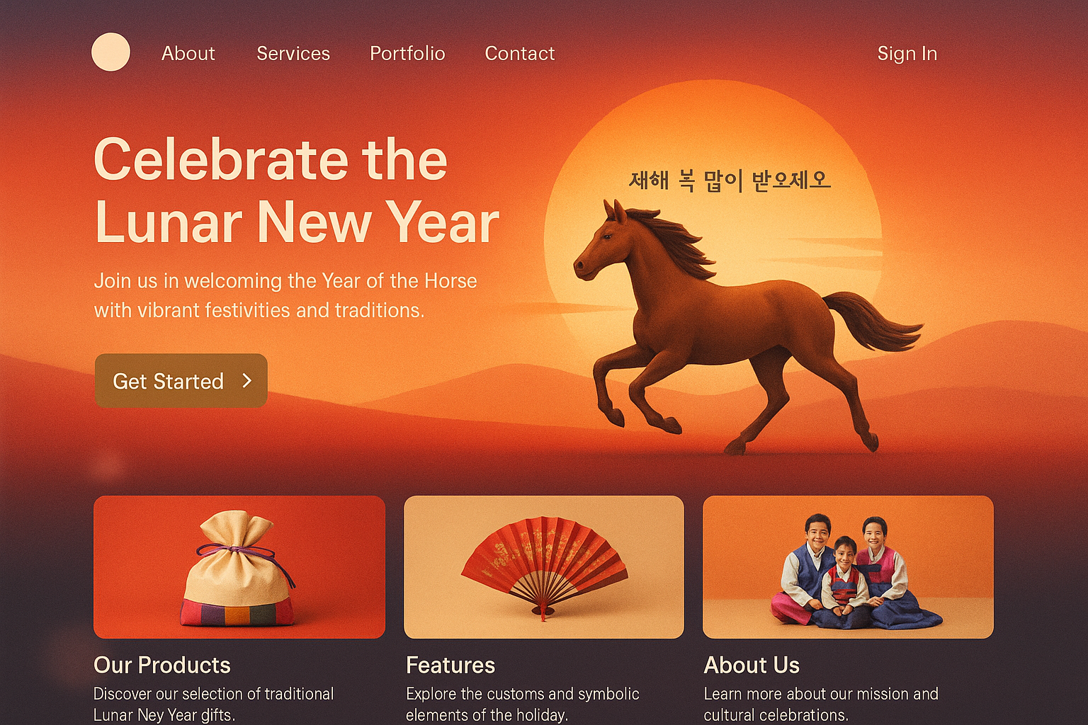 A visually appealing landing page celebrating the Lunar New Year with a dynamic horse illustration and vibrant colors. Features sections for products, features, and about us.