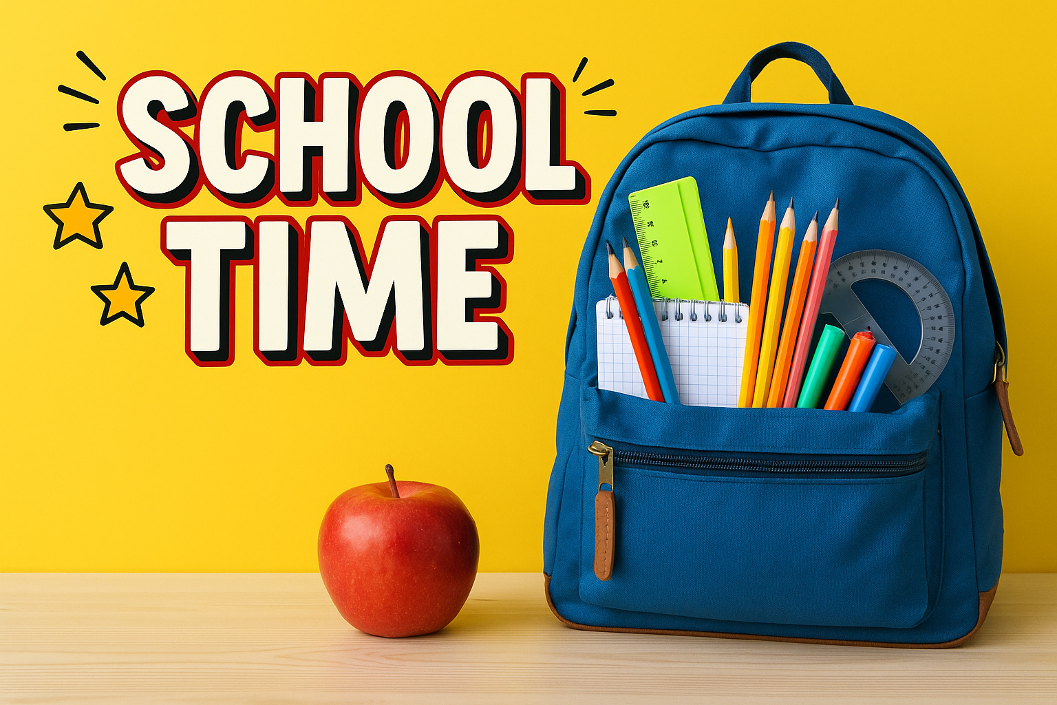 Vibrant graphic featuring a blue backpack filled with school supplies against a bright yellow background, ideal for education-related marketing and promotions.