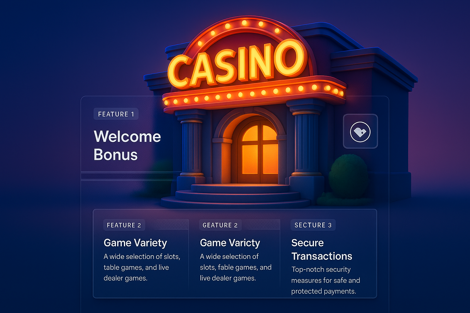 /Collection: /by davooda/Type: PNG/A vibrant 3D illustration of a casino entrance featuring a glowing 'CASINO' sign. The design includes blocks highlighting features like welcome bonuses and secure transactions, set against a smooth gradient background.
