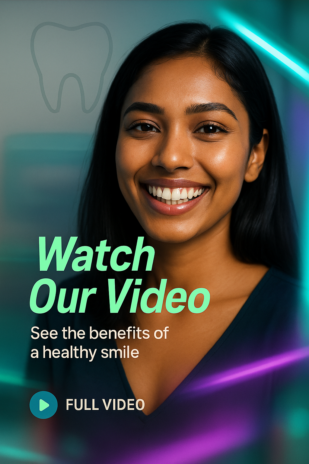 Promotional Video Thumbnail Featuring Smiling Woman and Dental Theme
