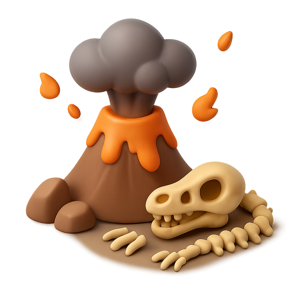 A playful and vibrant cartoon-style illustration featuring a volcano erupting with lava and a dinosaur skeleton nearby. Ideal for educational and creative projects.