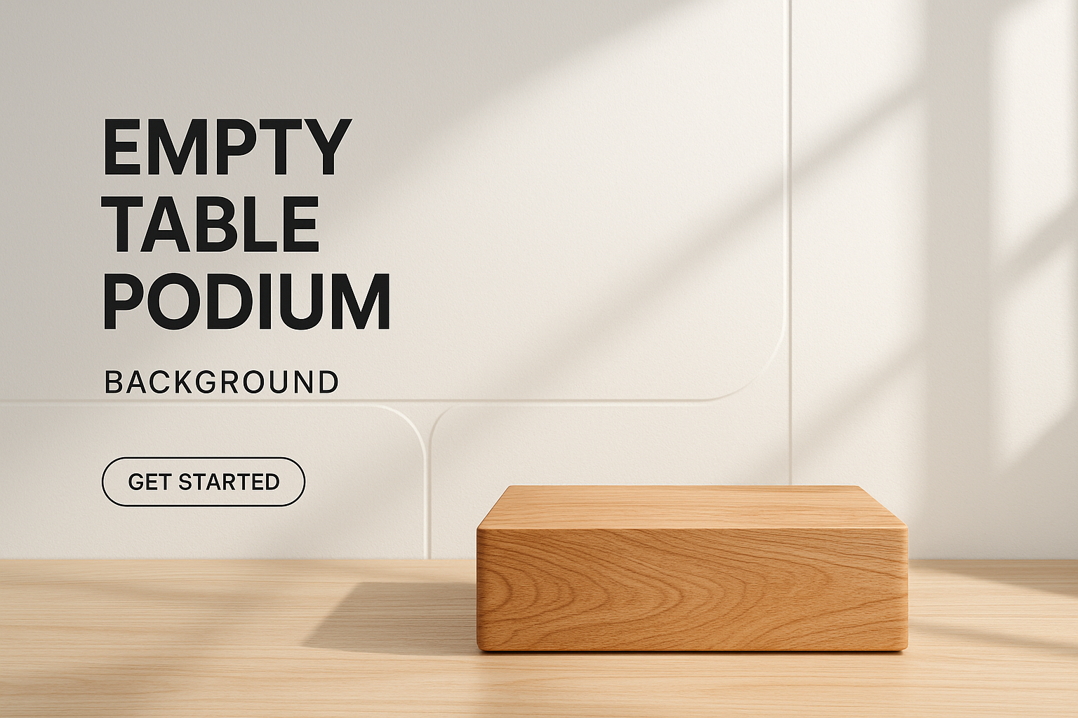 /Collection: /by davooda/Type: PNG/A minimal wooden table podium illuminated by sunlight, set against a white wall. Features bold typography and a clean, modern design ideal for showcasing luxury beauty products.