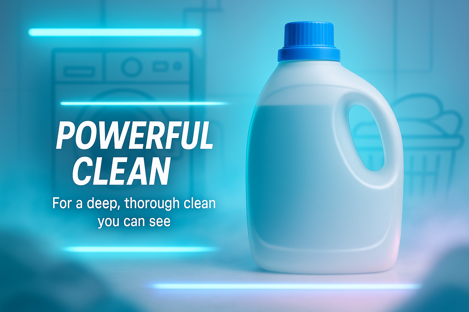 A modern promotional image showcasing a laundry detergent bottle with a clean design, emphasizing its effectiveness. Ideal for advertising in e-commerce platforms.