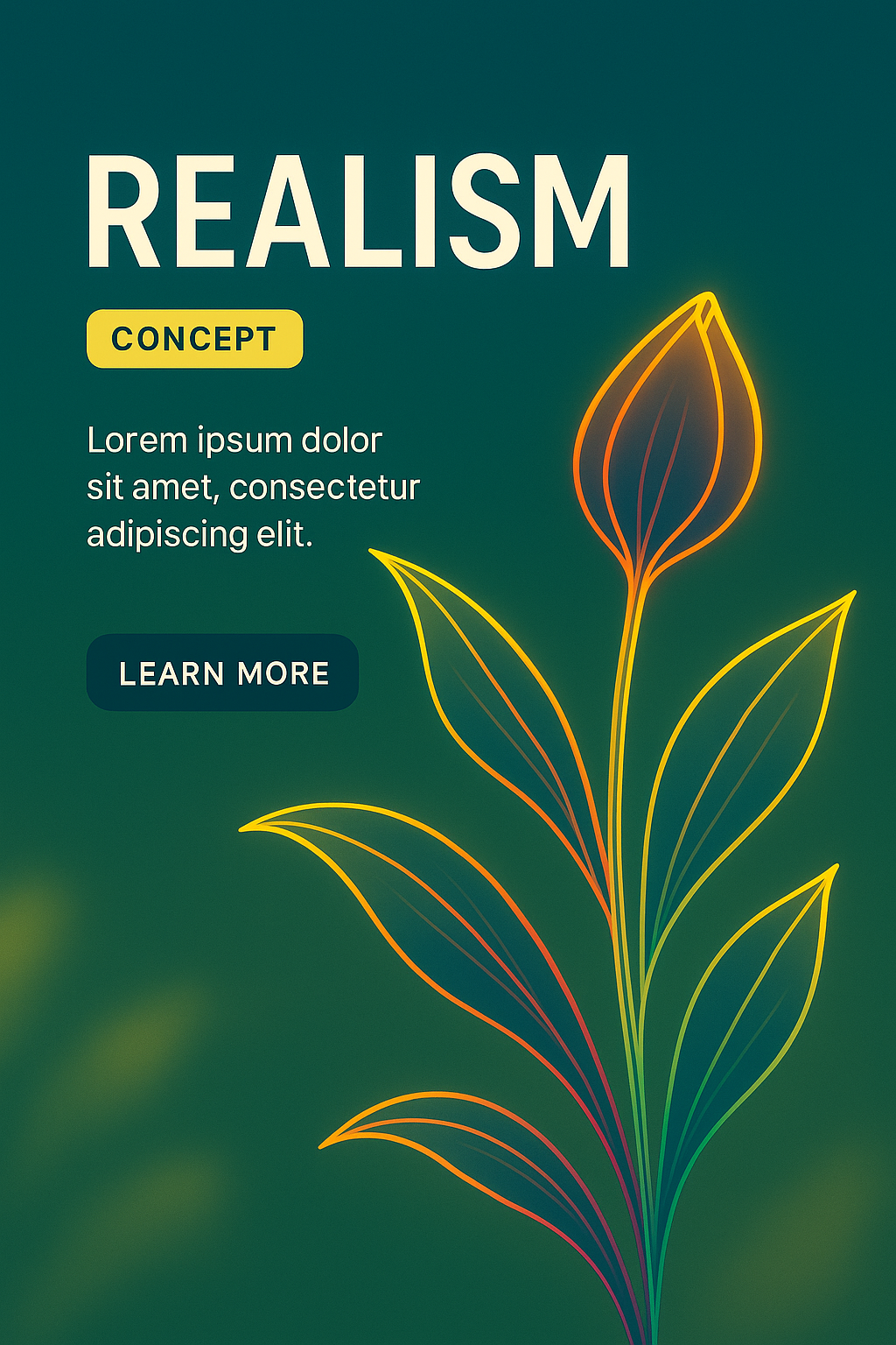 This is a vibrant graphic featuring a stylized floral illustration highlighting the concept of realism. Ideal for educational or promotional content.