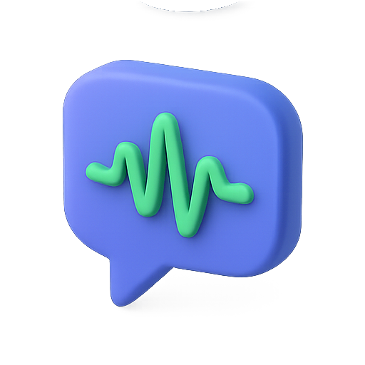 A stylized 3D icon depicting a chat bubble with a sound wave graphic, featuring a vibrant purple background and green wave, ideal for communication apps or audio-related content.