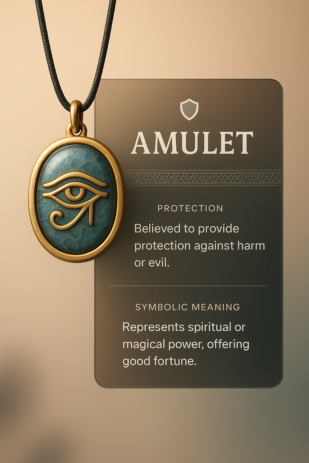 A beautifully crafted amulet with an eye motif hangs on a sleek background. Accompanying it is an elegantly designed text block detailing its symbolism and protective qualities.