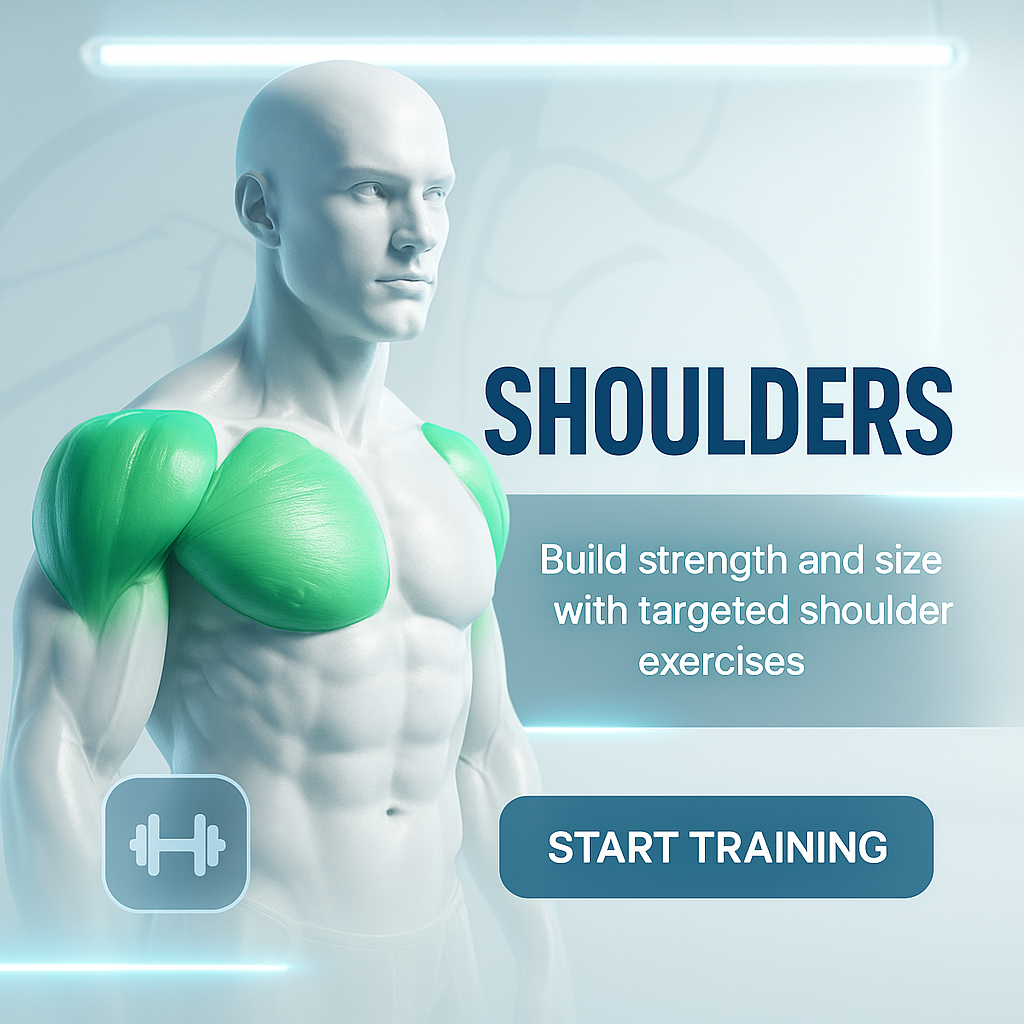 Modern fitness graphic showcasing a 3D figure emphasizing shoulder muscles, ideal for promoting workout programs. Suitable for health and fitness campaigns.