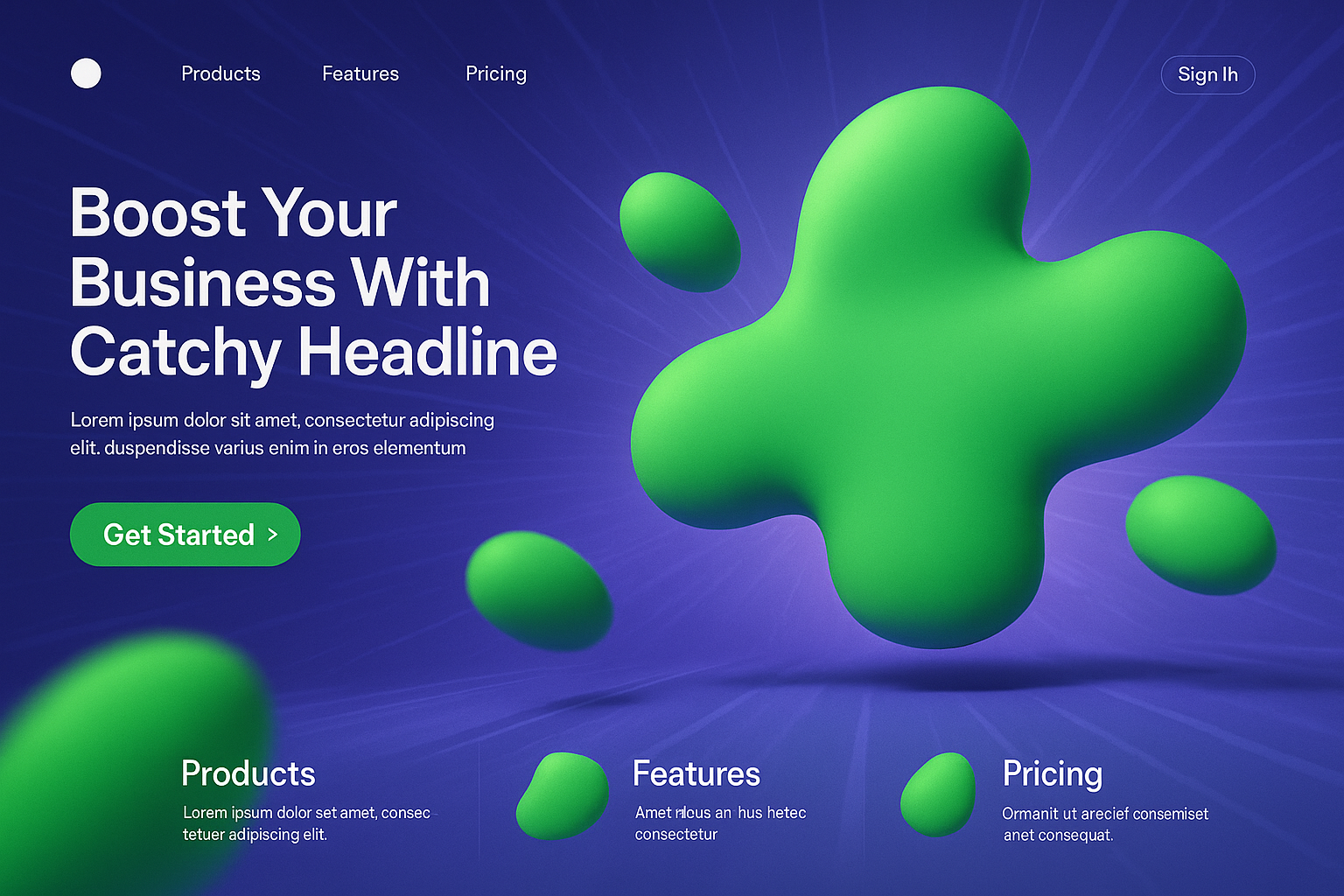 A visually engaging landing page featuring a catchy headline and dynamic green blob shapes. The layout includes sections for products, features, and pricing, designed for a large screen.