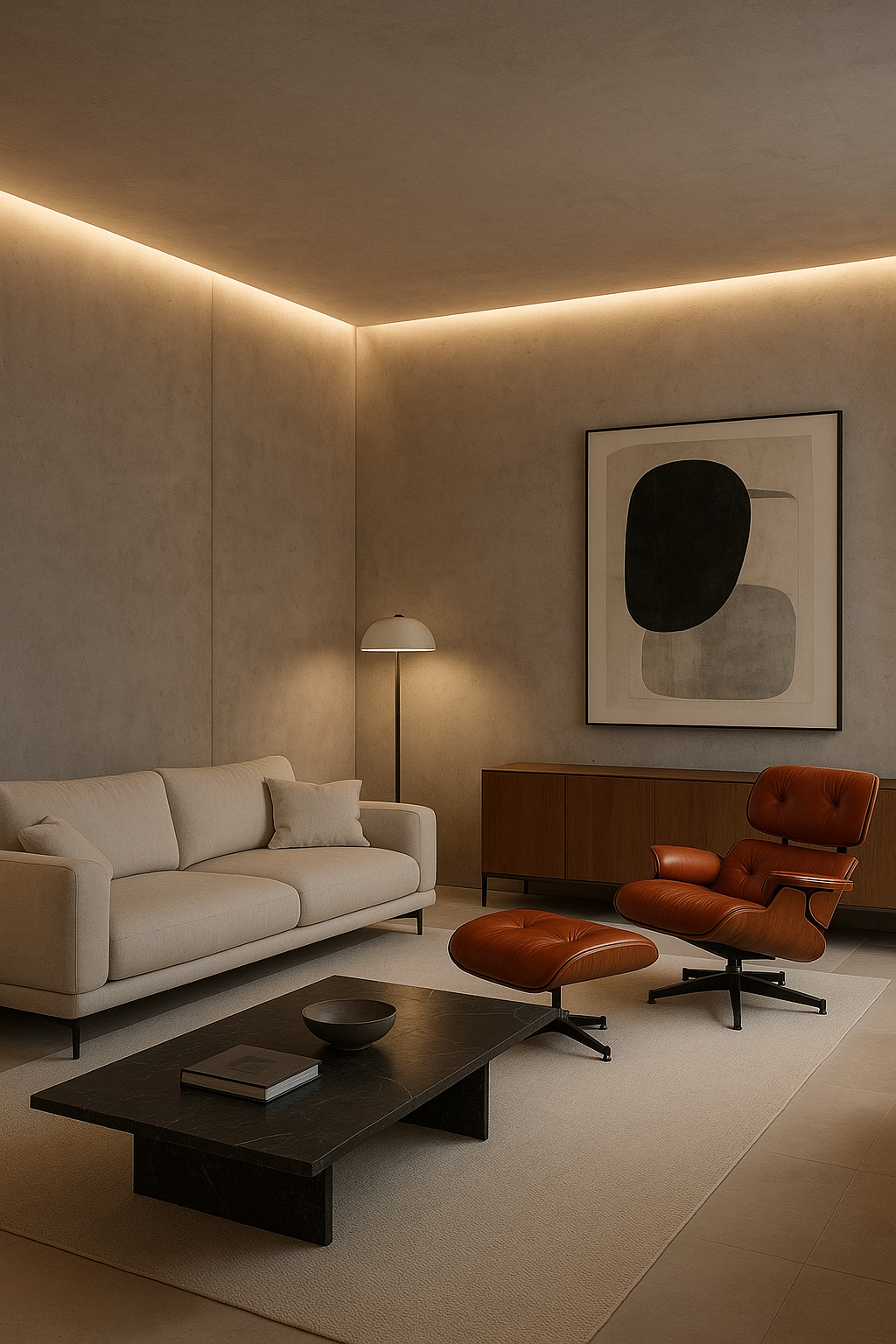 /Collection: /by davooda/Type: PNG/A contemporary minimalist living room featuring soft ambient lighting, concrete walls, a stylish sofa, and elegant Italian furniture elements, creating a serene atmosphere.